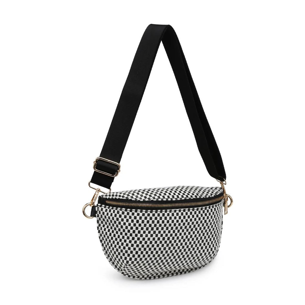 Gizelle — compact checker-print belt bag with an adjustable wide strap. Zip-top main compartment, exterior zip pocket for cards or keys, removable wide strap converts to crossbody. Durable metal hardware, structured silhouette, textured checker print for a statement finish. Big enough for phone, wallet, essentials, yet slim for hands-free days, travel, concerts. A stylish, practical addition to any modern wardrobe.