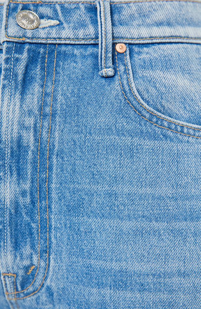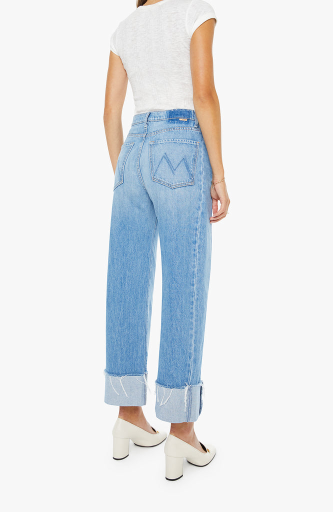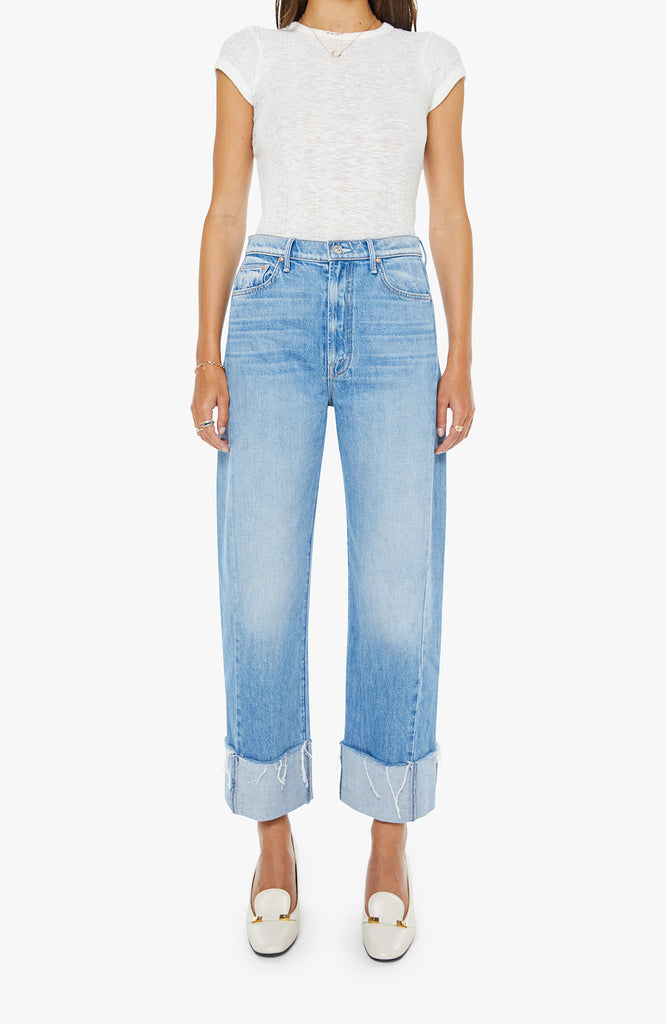 A super high-waisted barrel jean with a zip fly, wide, curved leg and an ankle-length inseam with a cuffed, frayed hem. Made from rigid SUPERIOR denim, Last Bite is a faded vintage blue with subtle whiskering.