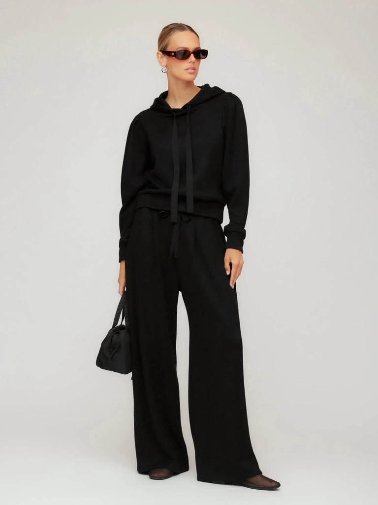 The Jenny Pleated Pants are designed with an elastic waistband and adjustable drawstring tie for ease and flexibility in fit. Crafted from a soft and cozy Double Brushed Knit, they feature subtle pleated detail at the top front for a tailored touch. The full-length, almost wide-leg silhouette creates a fluid and elongating look, while the pull-on style makes them an effortless everyday essential.