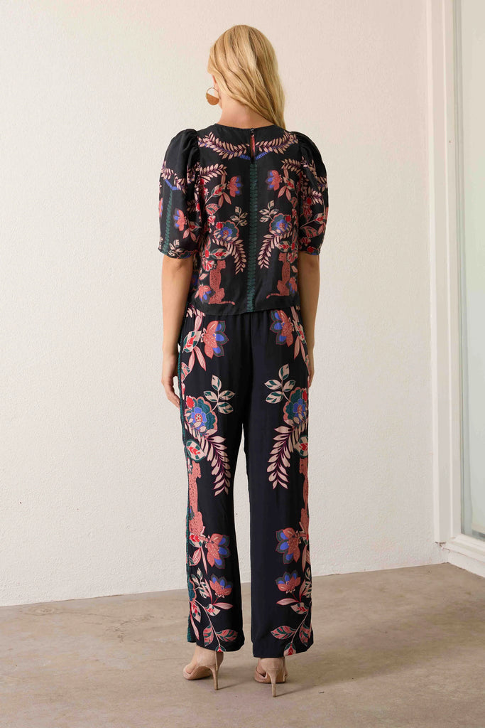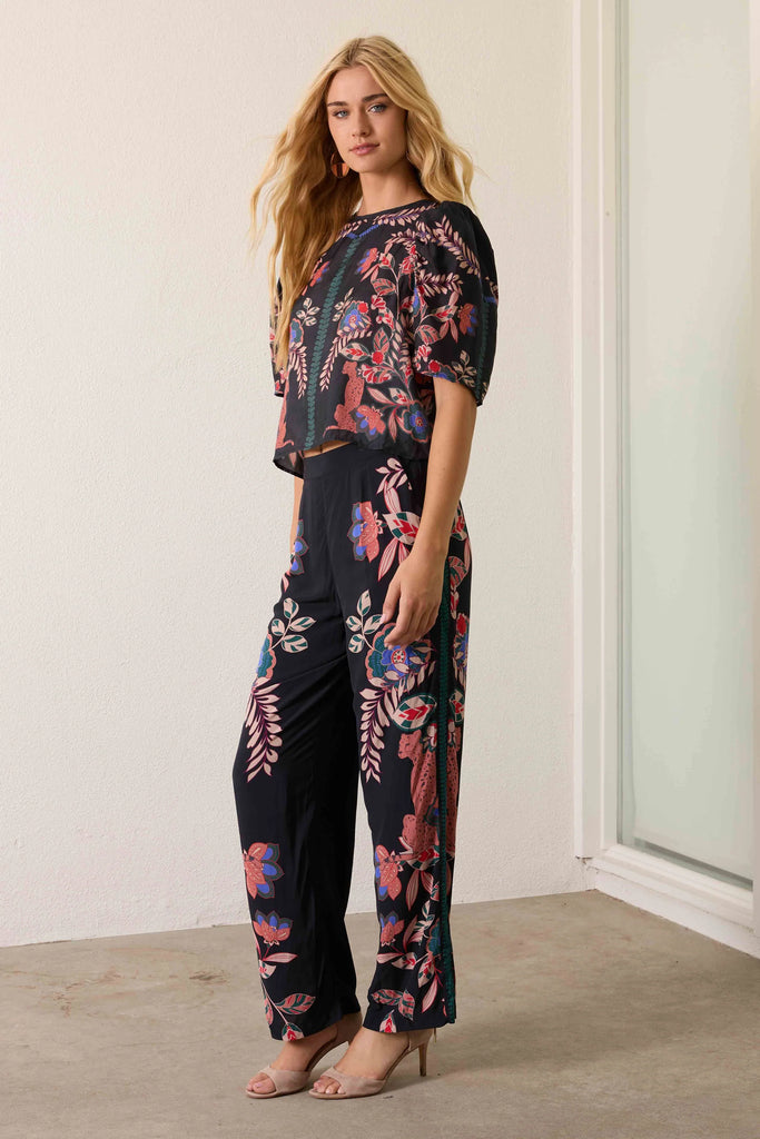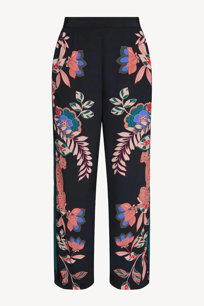 Crafted from Viscose, this iteration showcases a bold design with a leaf vine motif running down the side seams, framed by vibrant florals and stylized cheetahs against a deep black backdrop. With its soft, fluid drape and statement-making print, the Maxine Pant blends timeless elegance with standout style — perfect for both day and evening wear.