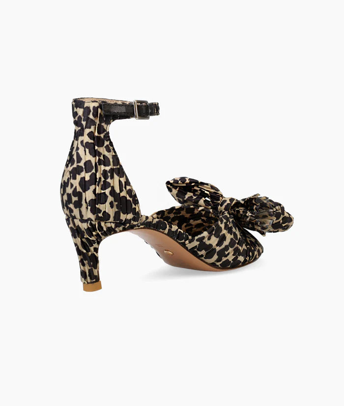 Color/Material: Leopard pleated fabricClosure: Adjustable buckleLining: SyntheticOutsole: LeatherHeel height: 2 in.