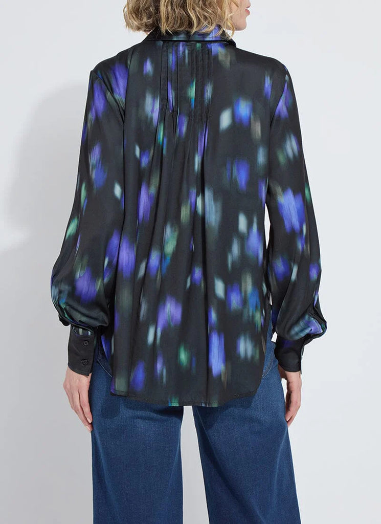 The Aitana Utility Pleated Detail Blouse, made from luxe Lightweight Satin, features statement sleeves with pleats and cuffs, front pockets with buttons, a menswear collar and covered front placket. Showcasing a digital print designed exclusively for Lyssé, the Aitana Utility Pleated Detail Blouse offers a relaxed fit, soft end feel and rounded shirttail hem. This seasonless top styles beautifully tucked into the Penelope Curved Cuffed Denim jean. Upon delivery, gently steam or iron to remove wrinkles.