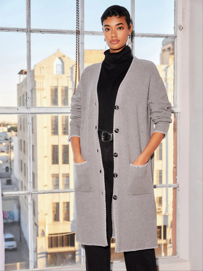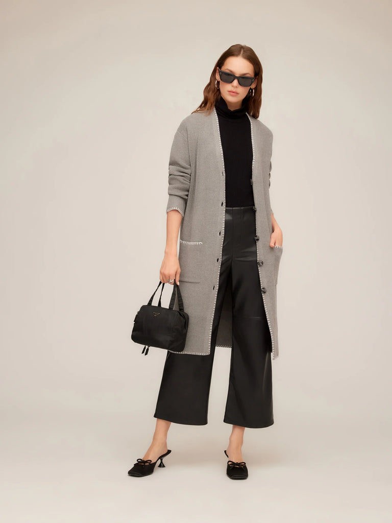 Crafted with a touch of cashmere for an ultra-soft feel, it features long sleeves, drop shoulders, and a relaxed silhouette for effortless layering. Contrast edge stitching adds a subtle statement detail, while front patch pockets and a button-down closure offer practical polish.