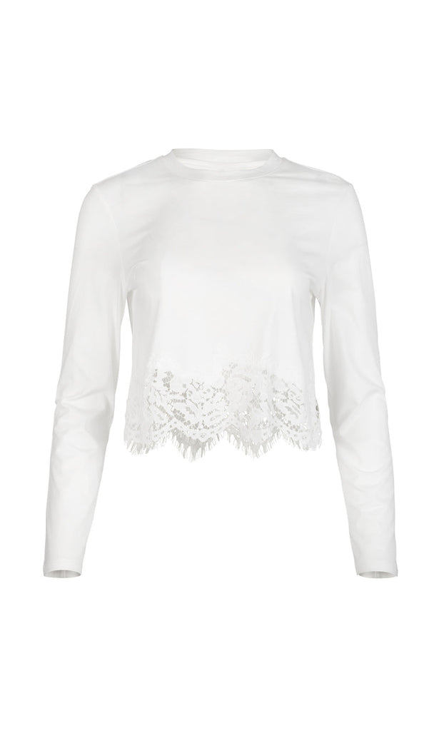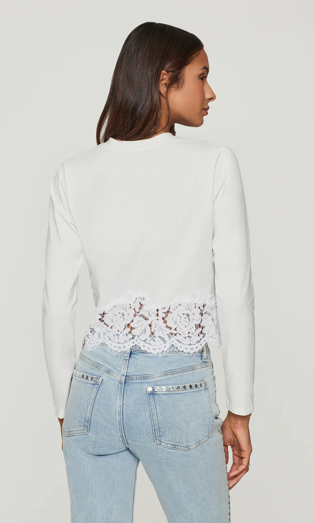 The Tabitha Lace Combo Top blends everyday ease with delicate detail. Crafted from soft cotton jersey and finished with a floral lace hem, this long-sleeve style adds a romantic twist to a classic crewneck silhouette. Dress it up with tailored pants or down with denim for effortlessly refined style year-round.