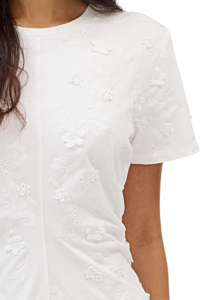 Our version of a t-shirt dress — anything but basic! We customized this 3-D eyelet fabric on a jersey base.