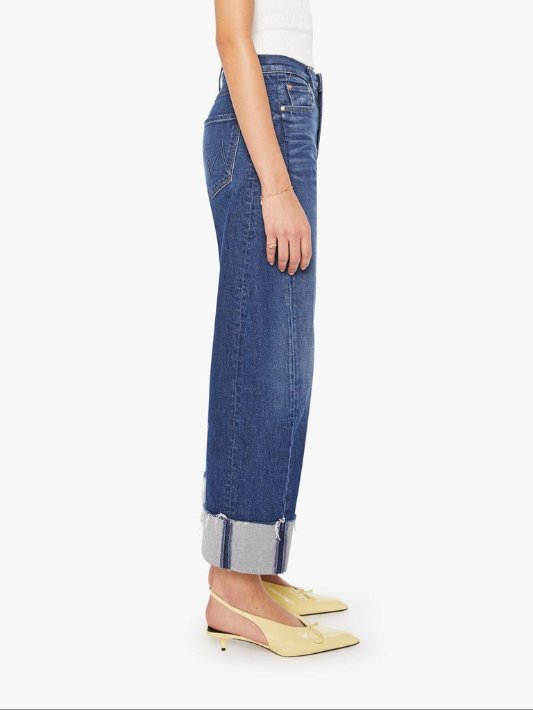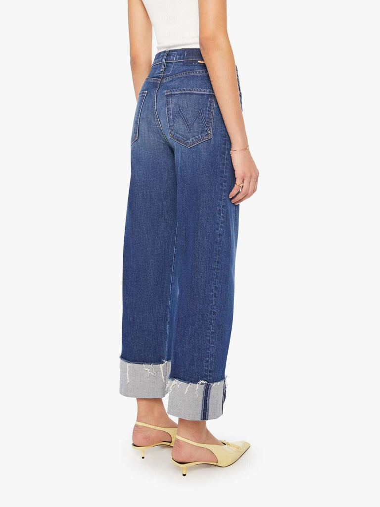 A super high-waisted barrel jean with a zip fly, wide, curved leg and an ankle-length inseam with a cuffed, frayed hem. Made from semi-rigid SUPERIOR denim, Perfectly Imperfect is a dark blue with whiskering and fading at the knees.