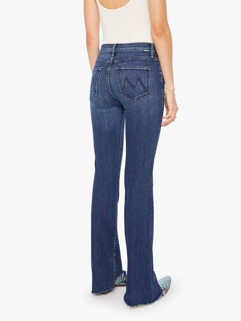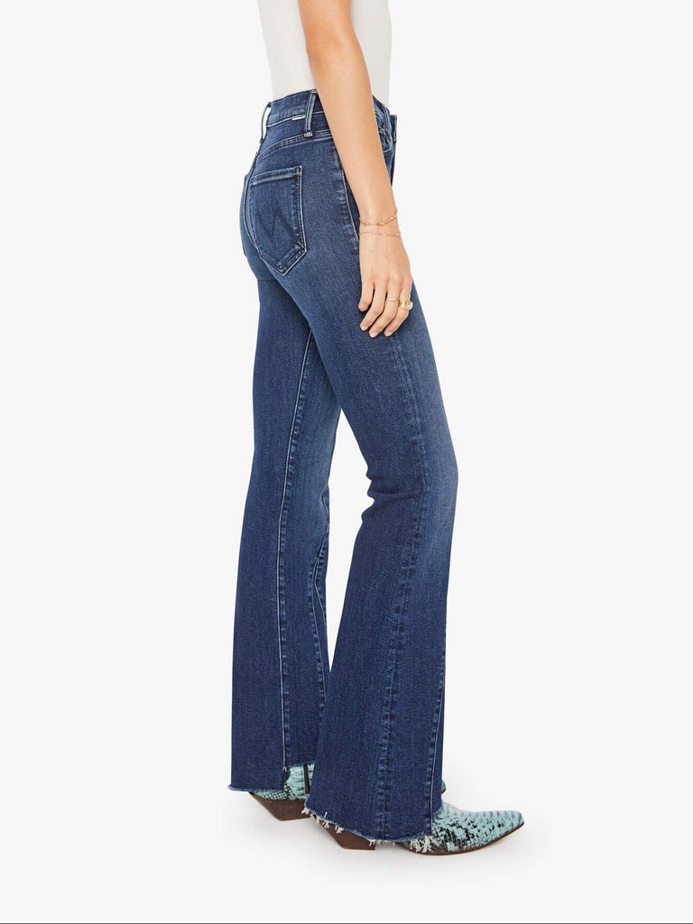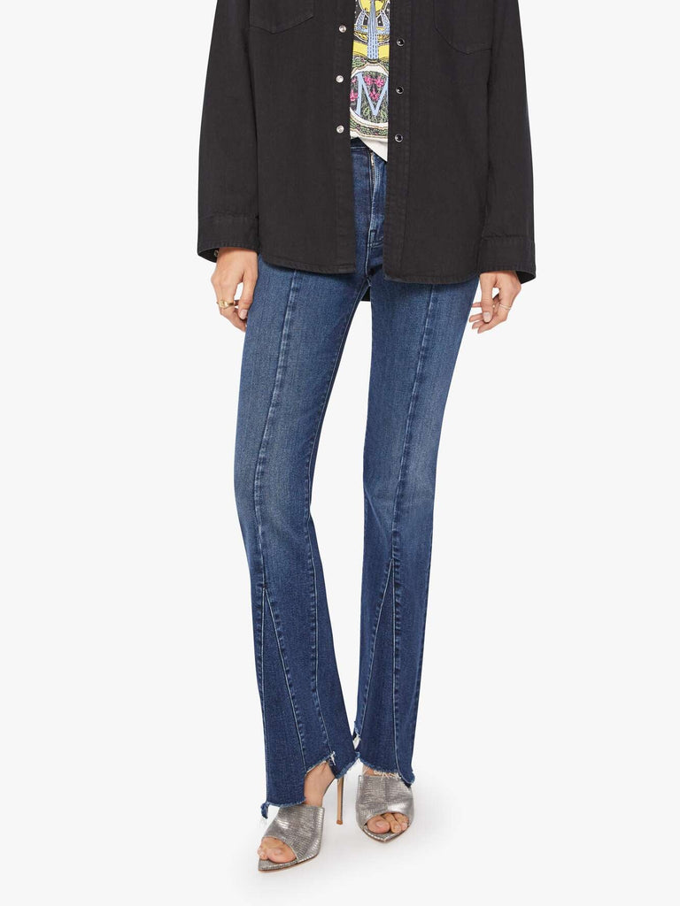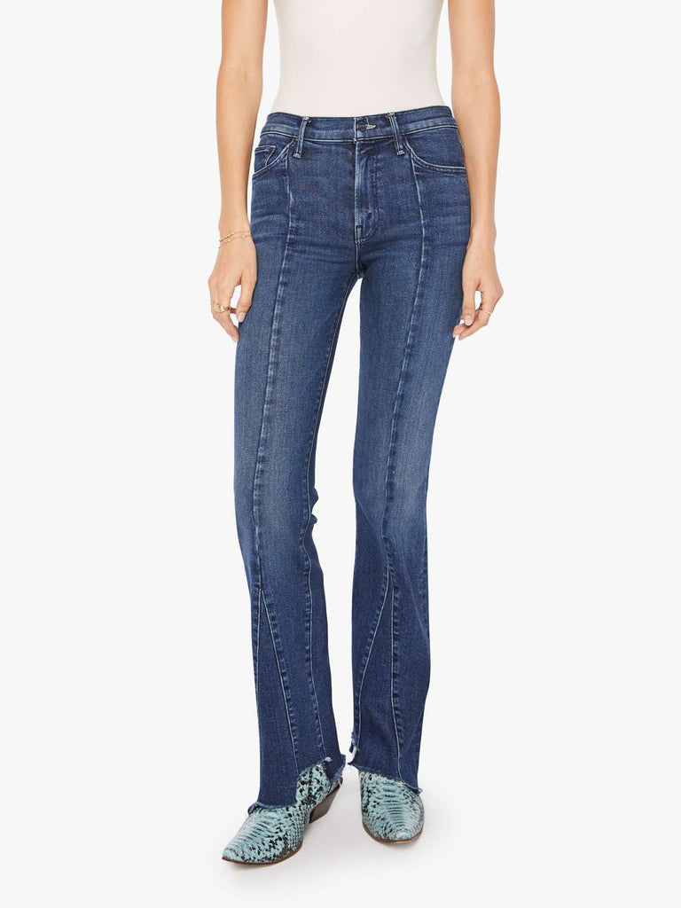 Life of the party. This iconic high-waisted bootcut features a zip fly, seamed details down the front, a 31-inch inseam and a frayed triple step-hem. Made from stretch denim, You're A Riot is a dark blue with subtle whiskering and fading at the knees.