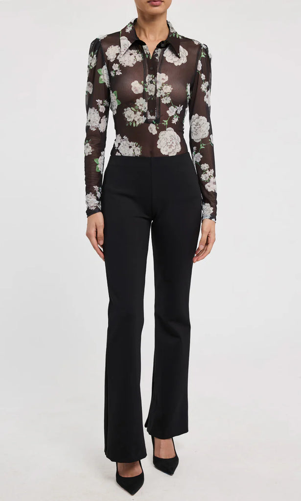 The Dominique Floral Mesh Top is where sheer allure meets timeless femininity. Crafted from printed stretch mesh, this Henley-style top features long sleeves and a button placket, balancing sultry transparency with classic tailoring. The romantic black-and-white floral print makes it versatile for layering—wear it over a lace bralette for night or under a blazer for polished daytime styling.