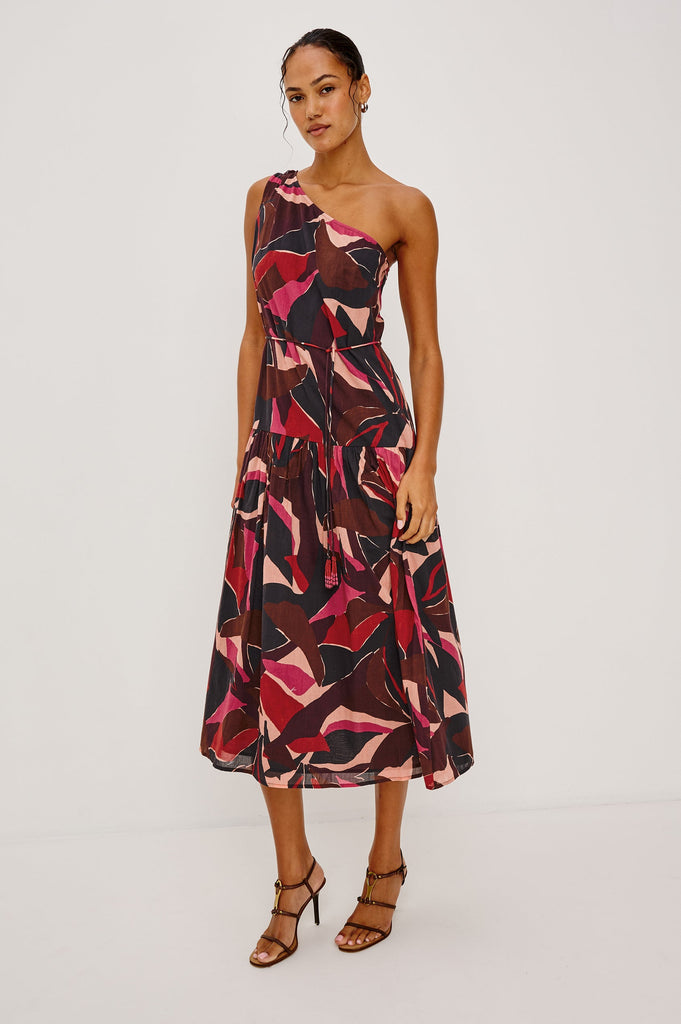 The Cecile features a lively abstract print, a timeless one-shoulder neckline, adjustable waist-defining ties with beaded tassels, and a dropwaist silhouette that softly flares to a midi hem, fully lined with a side zipper closure.