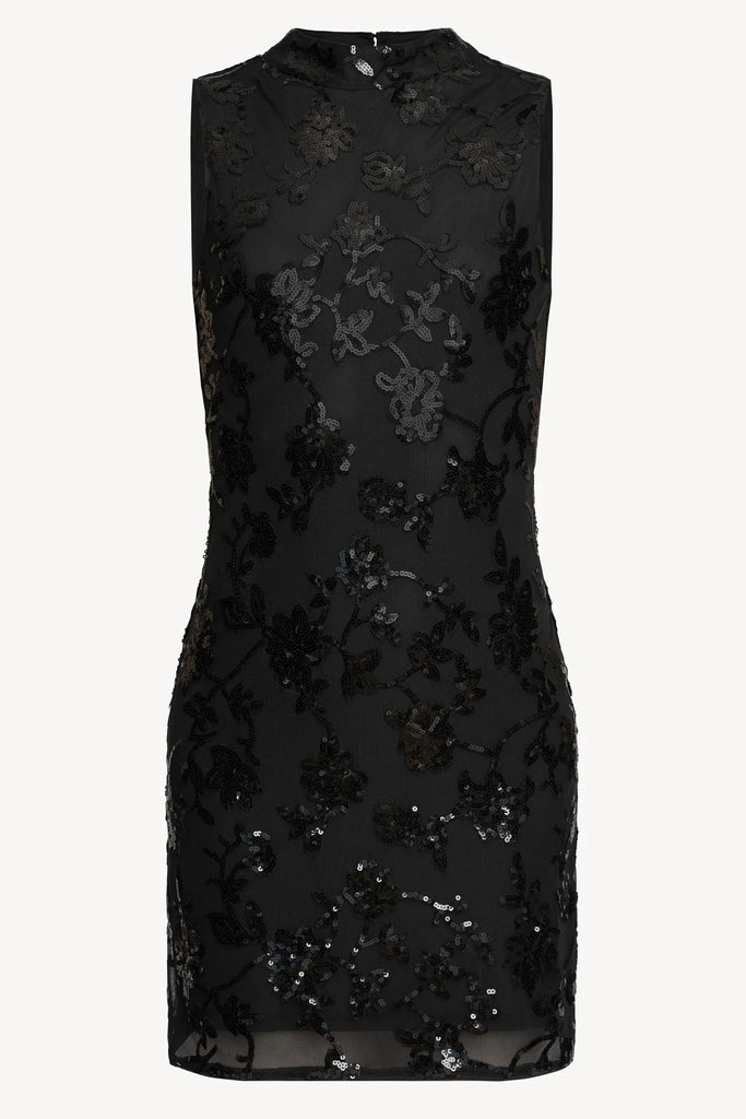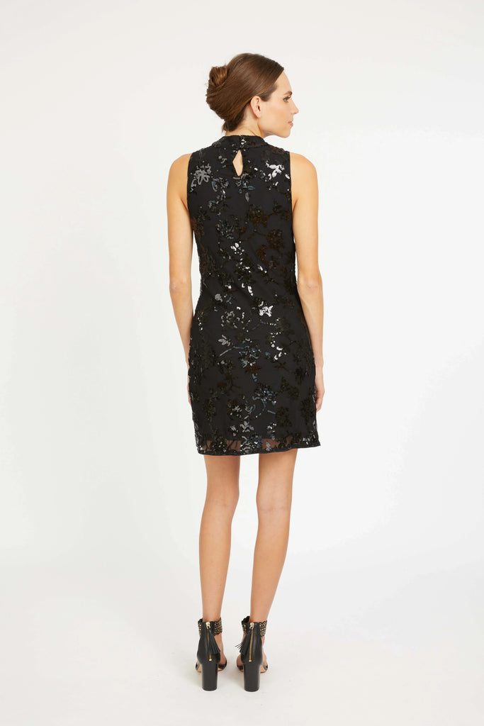 The Rayne Dress in Black Sequin Lace is a sleek, sleeveless mini dress that combines modern elegance with eye-catching detail. Designed with a high neckline and a tailored silhouette, it features intricate floral sequin embroidery layered over mesh for a striking play of texture and shine.