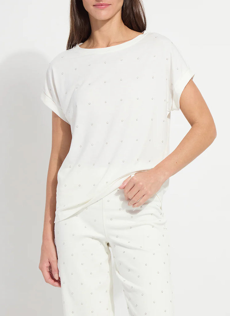 The Nisha Metal Heatset Pearl Top offers a distinctive, chic look with Allover Metal Rimmed Pearl Embellished Studs combined with the comfort of 4-way stretch Rayon Jersey. Offering drop shoulders, self-cuffs, an open neckline and high-low hem, the Nisha perfectly pairs with the matching Audrey Denim Pants and Jacket. Turn inside out to machine wash.