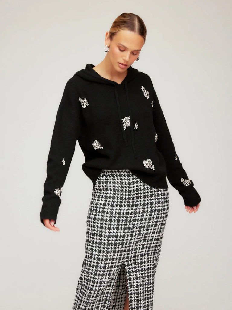 The Krystal Embellished Hoodie brings elevated detail to a casual classic. Designed with drop shoulders and long sleeves, it offers a relaxed, easy pull-on fit. The cozy hoodie silhouette is accented with a tie-neck drawstring, blending comfort with function. Sparkling embellishments are scattered across the front and sleeves, adding a luxe touch to the laid-back style.