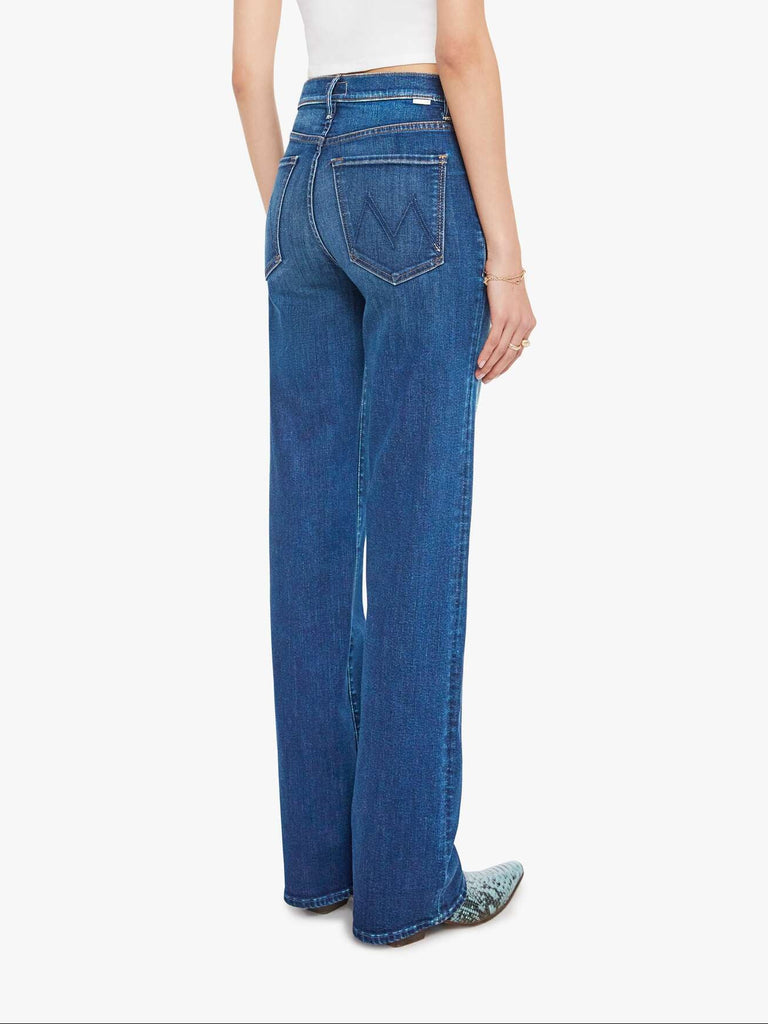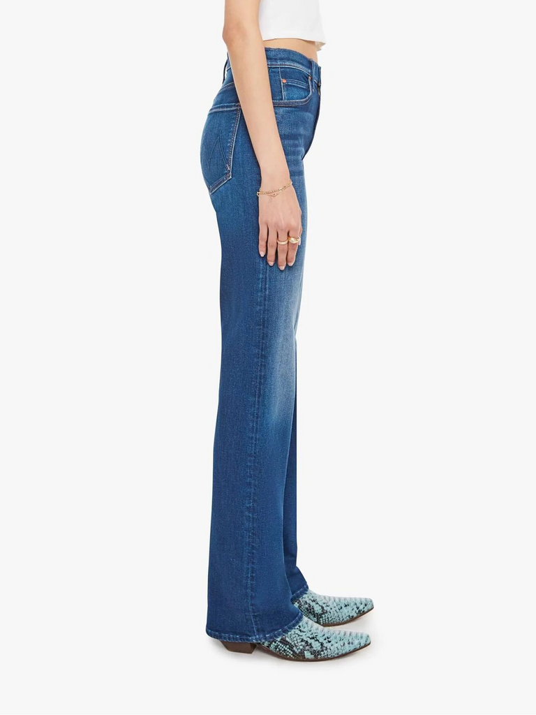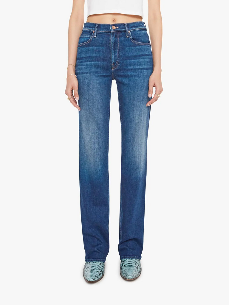 Up to no good. A high-rise straight-leg jean with a zip fly, 32-inch inseam and a clean hem. Made from a blend of recycled stretch denim, Troublemaker is a mid-blue with whiskering and fading at the knees.
