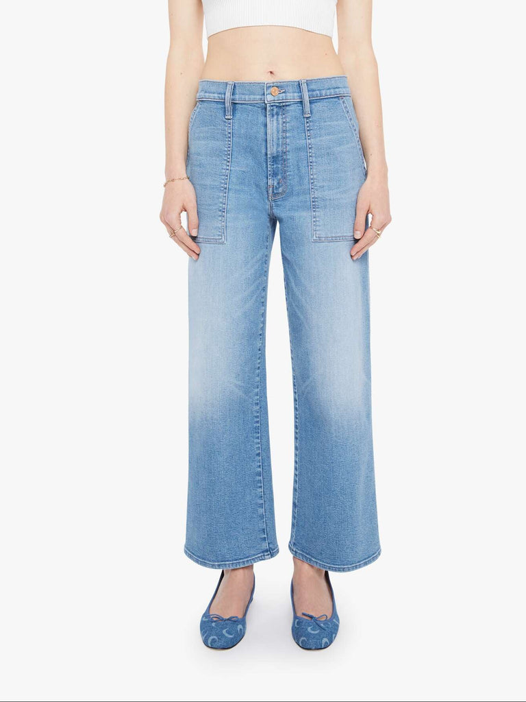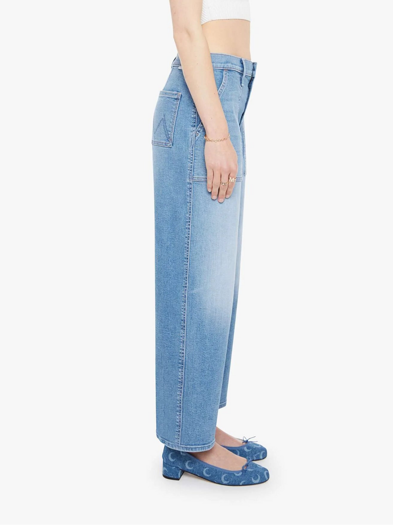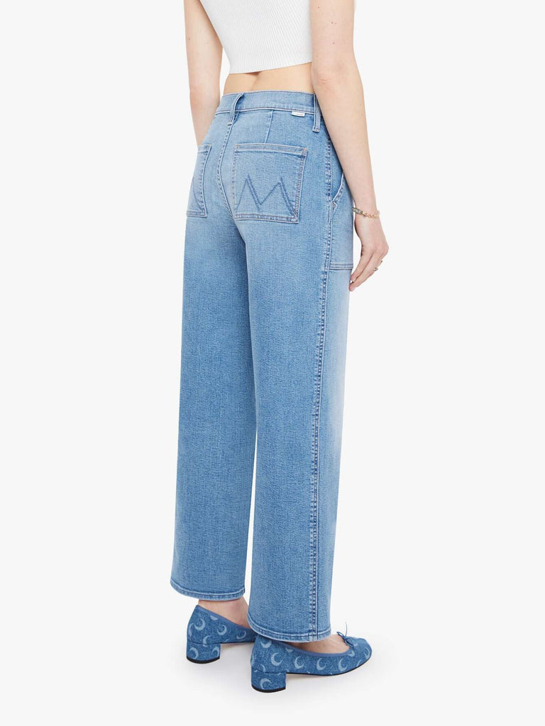 Full throttle. Super high-waisted jeans with a loose fit, wide leg, zip fly, patch pockets and a 28.25-inch inseam with a clean hem. Made from a blend of recycled stretch denim, Ride Hard Live Louder is a light blue with subtle whiskering and fading at the knees.