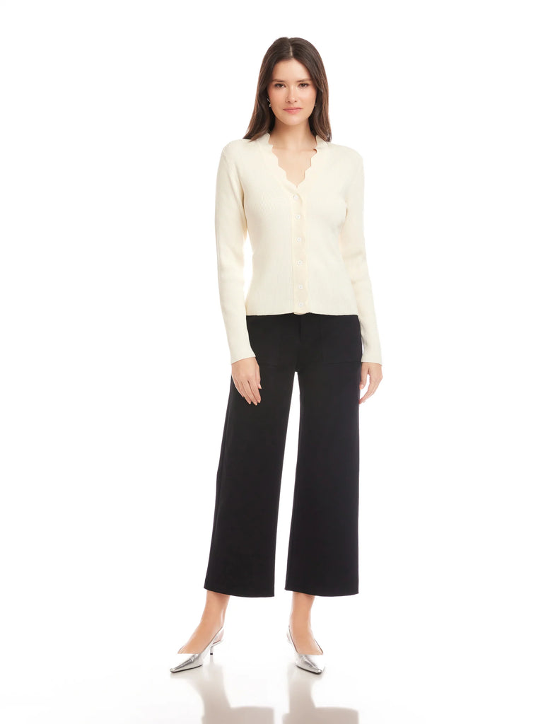 The Bliss Scallop Edge Cardigan is a refined knit with feminine detailing. Designed with long set-in sleeves and a ribbed texture, it offers a slim yet comfortable fit. A delicate scalloped edging runs along the neckline and placket, complementing the front button closure and deep V-neckline for a touch of elegance.