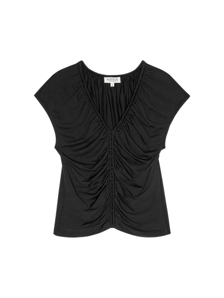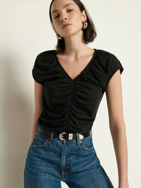 A chic, casual essential you'll want to wear on repeat, this ruched V neck tee is made from our ultra-soft, always-flattering Luxe Jersey Spandex. This one comes in Jet Black.