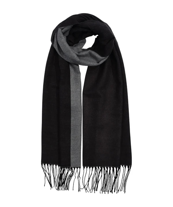 The Double Face Scarf features fringed edges, a dual-toned design, and a soft, brushed texture.
