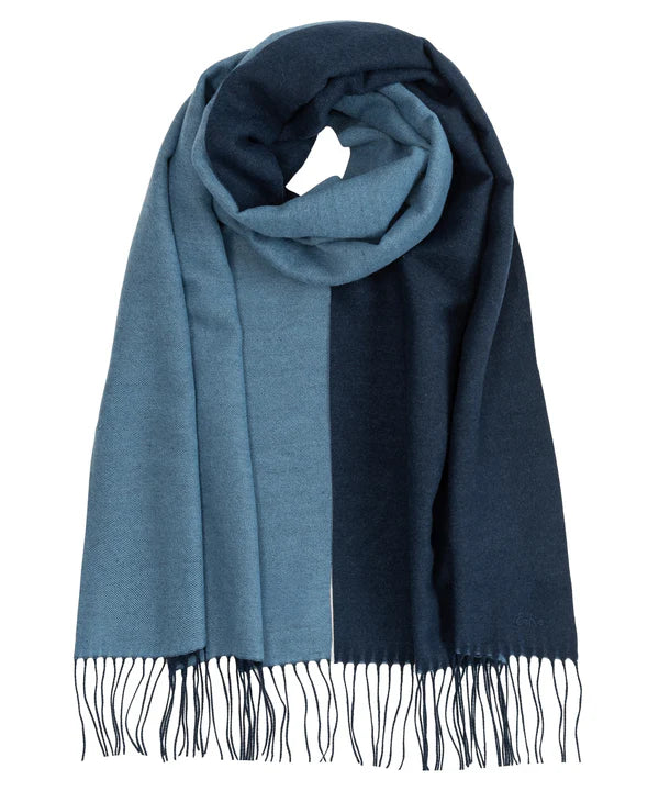 The Double Face Scarf features fringed edges, a dual-toned design, and a soft, brushed texture.