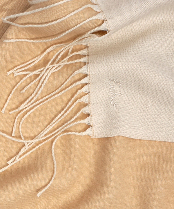 The Double Face Scarf features fringed edges, a dual-toned design, and a soft, brushed texture.