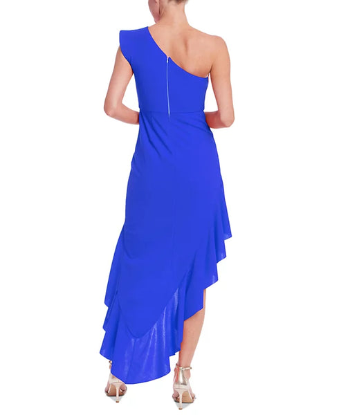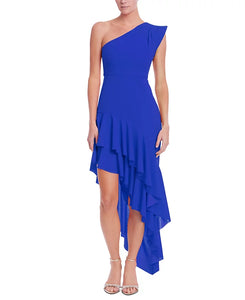 Figure-skimming stretch crepe hugs in all the right places, offering a structured fit that moves with you. The one-shoulder design, anchored by a sleek cap sleeve, enhances that sculpted shape while keeping the look fresh and modern. Then there’s the ruffle—a cascading, asymmetrical detail that sweeps down the high-low hem, creating movement with just the right amount of drama.