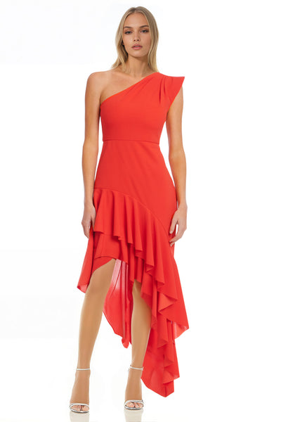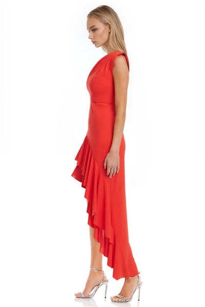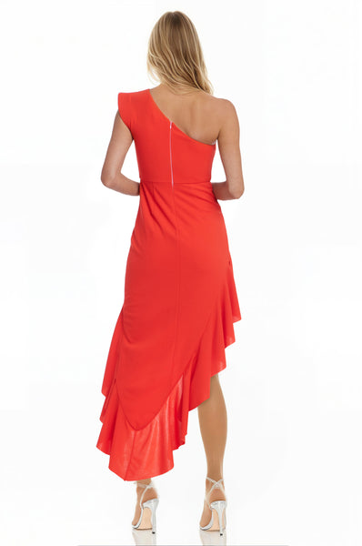 Drenched in confidence, the High Low Ruffle Dress brings just as much fire as its color. Its modern design is all in the details—from the crisp cap sleeve to the dramatic high-low hem and cascading ruffles. The result is a flawless balance of flirty movement and sculpted attitude, perfectly suited for everything from grand entrances to dance-floor twirls.