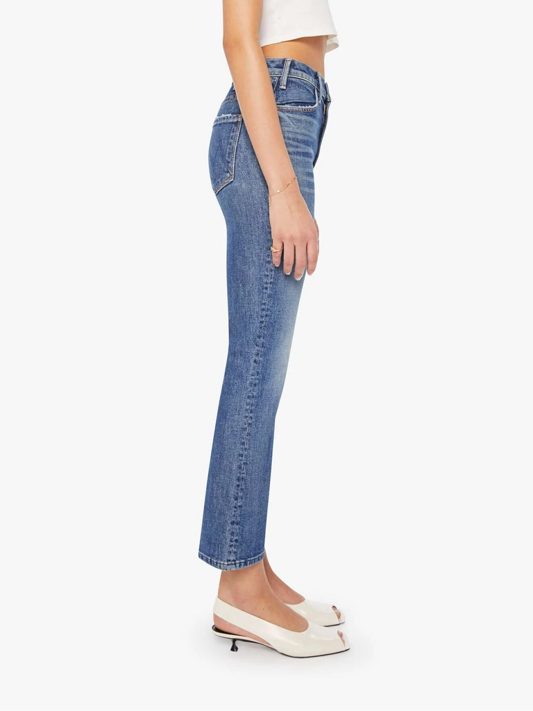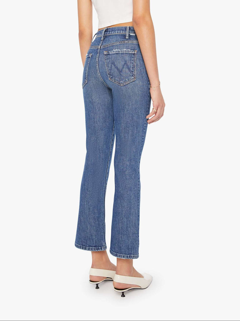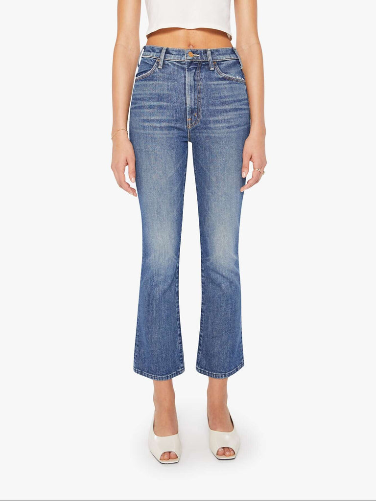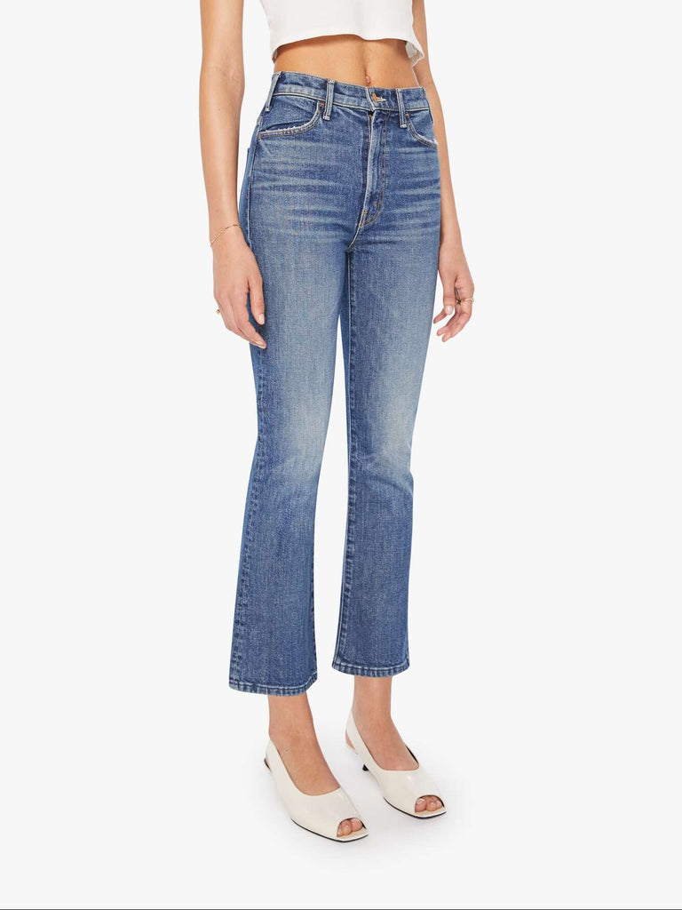 MOTHER makes the rules. This bestselling high-rise flare has a zip fly, ankle-length inseam and a clean hem. Crafted from semi-rigid denim, Bending The Rules is a mid-blue with whiskering and fading at the knees.