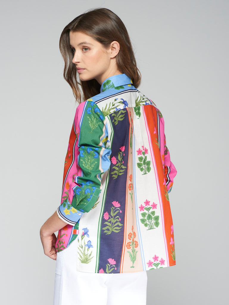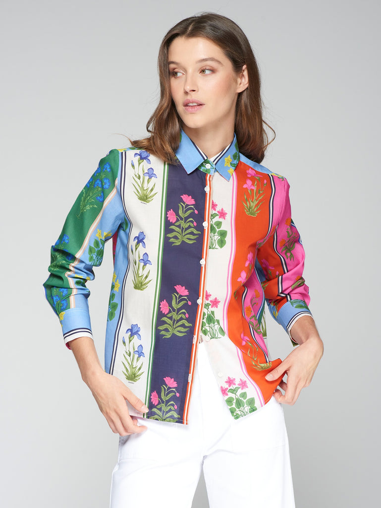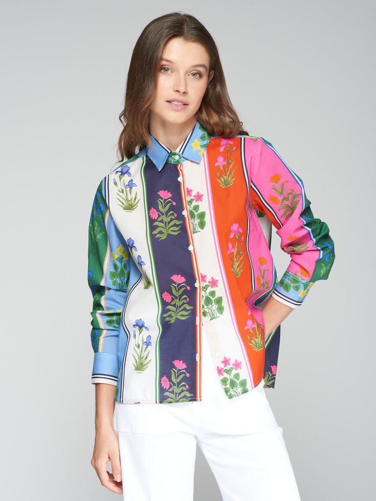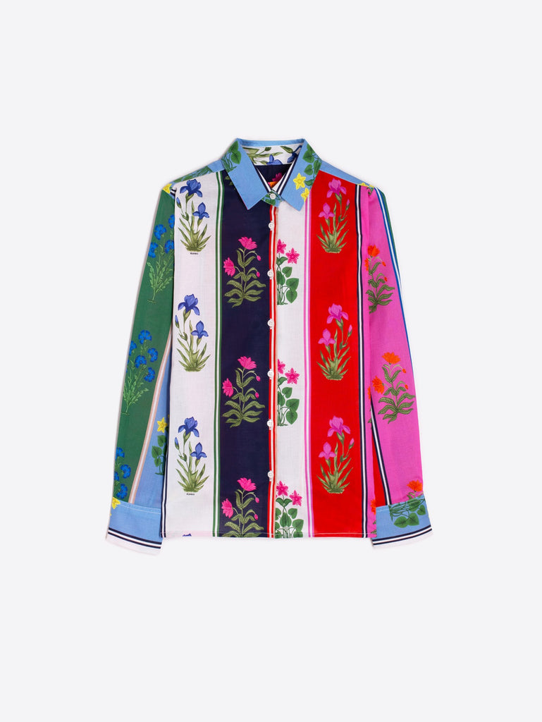 Shirt with coloured vertical stripes and printed flowers. Front fastening with shirt buttons. Long sleeves with cuffs. The model is 1.72 m tall and wears size 38.