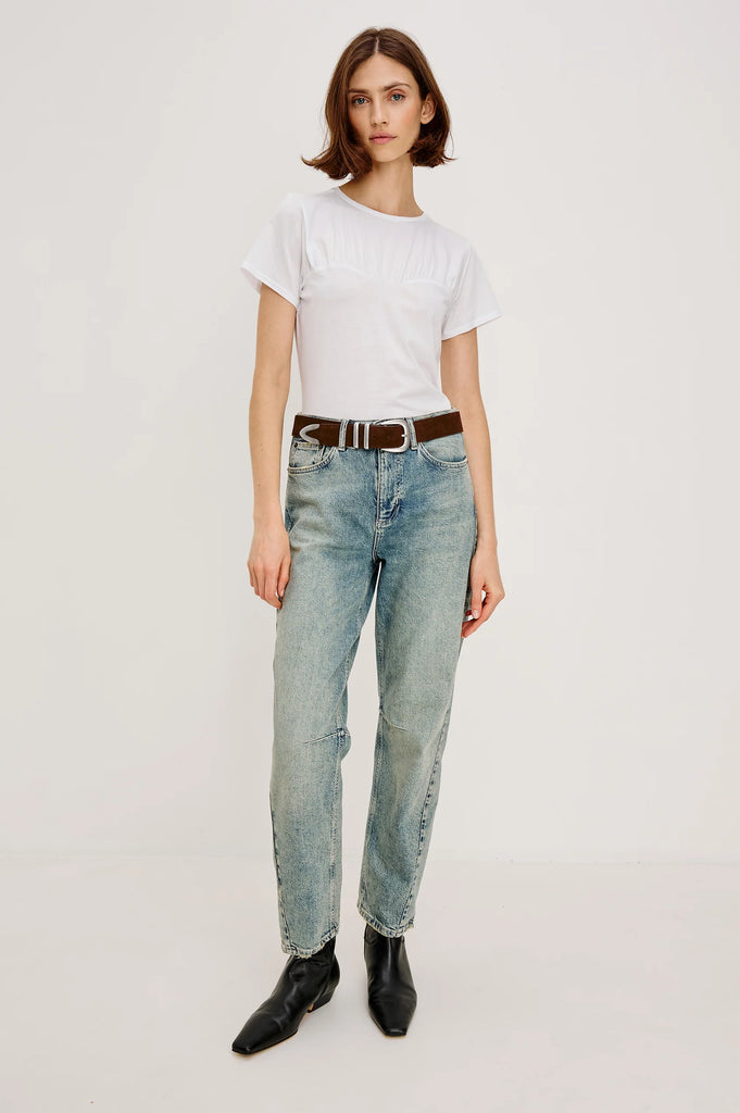 The Janis is a 100% cotton t-shirt with a sweetheart neckline and shirred detailing. It features a classic fit for easy styling.