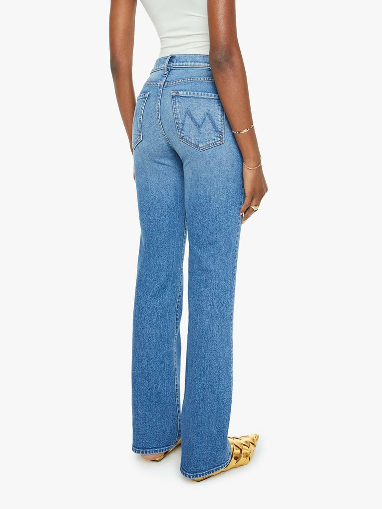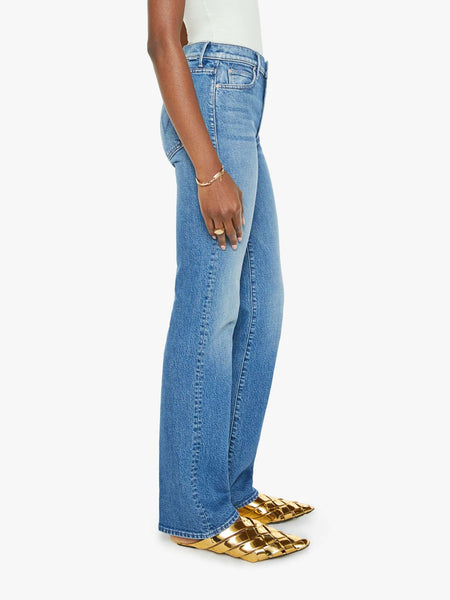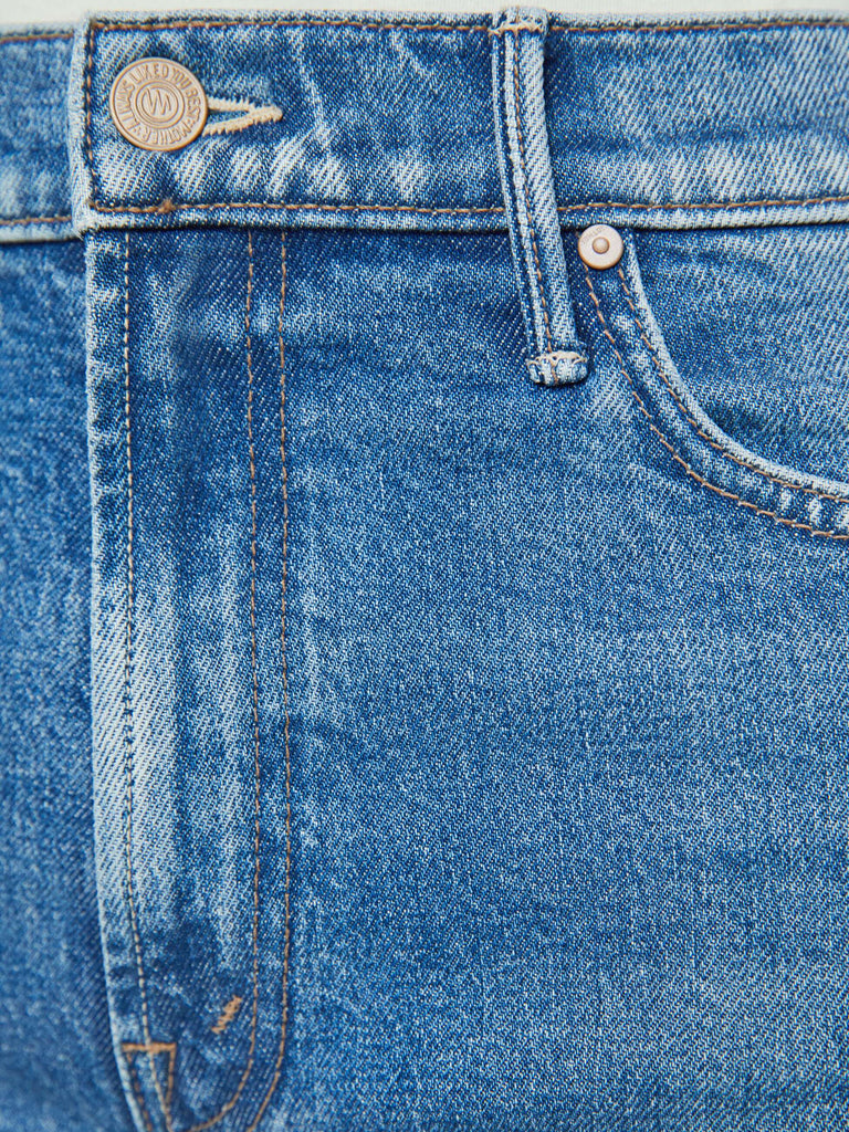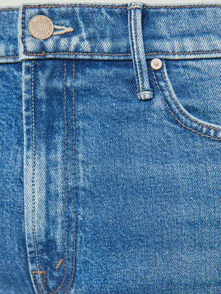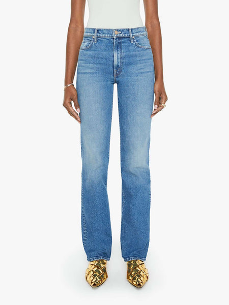 Happy hour. A high-rise straight leg jean with a 32-inch inseam and a clean hem. Made from denim with a touch of stretch, Tequila Sunrise is a mid-blue with whiskering and fading at the knees.