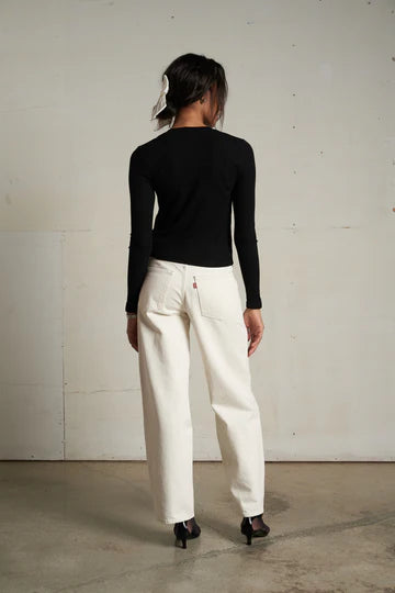 the maureen top is your fitted button-down, upgraded. made from our luxe rib, this long sleeve style is soft, sculpted, and hits right below the belly button. with just the right amount of stretch and a clean silhouette, she layers with ease and holds her own when worn solo.