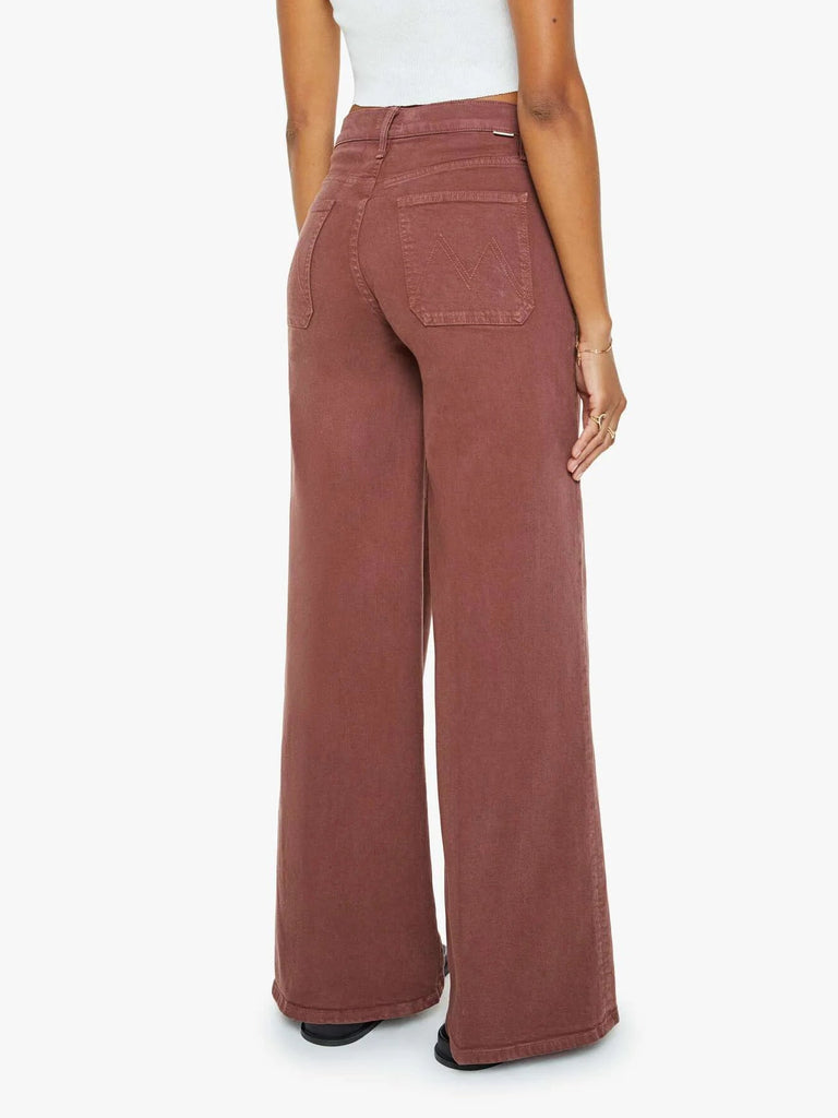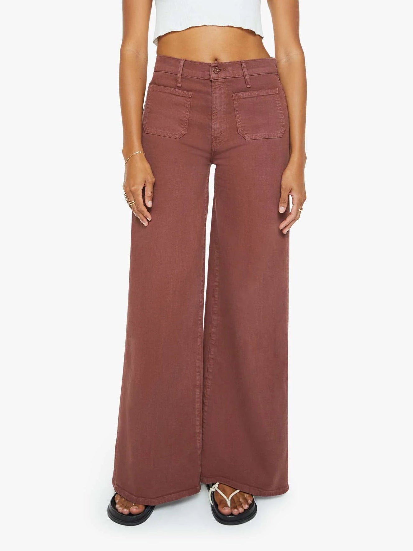 Wide leg pants with a high rise, 32-inch inseam, patch pockets and a clean hem. Made from a cotton blend with a touch of stretch, the pants are designed in a rust brown with subtle fading and tonal hardware.