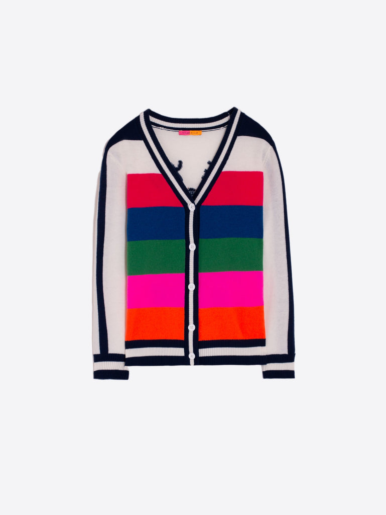 Cardigan with coloured stripes on the front and white back with flower intarsia and a racket. Front fastening with buttons. V-neck. Model is 1.79 and wears size S.