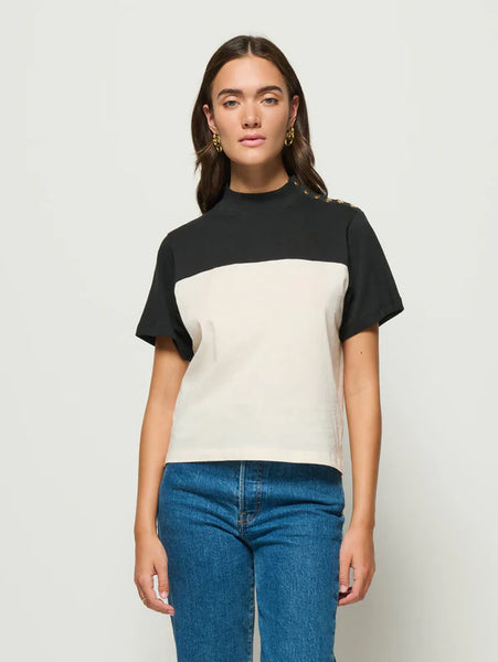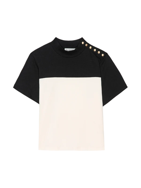 With a mock, ribbed neckline, front and back yoke, and a functional gold snap closure at the shoulder, this tee is soon to be your seasonless go-to. This one comes in Jet Black Color Block.